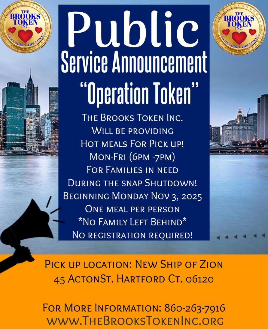 Empowering families to thrive during this challenging time! The Brooks Token Inc. is launching a hot meal initiative . Starting Monday, November 3, 2025, through the snap shutdown period. Monday-Friday 6-7pm, families can pick up a hot meal and beverage at one of our community partner locations: